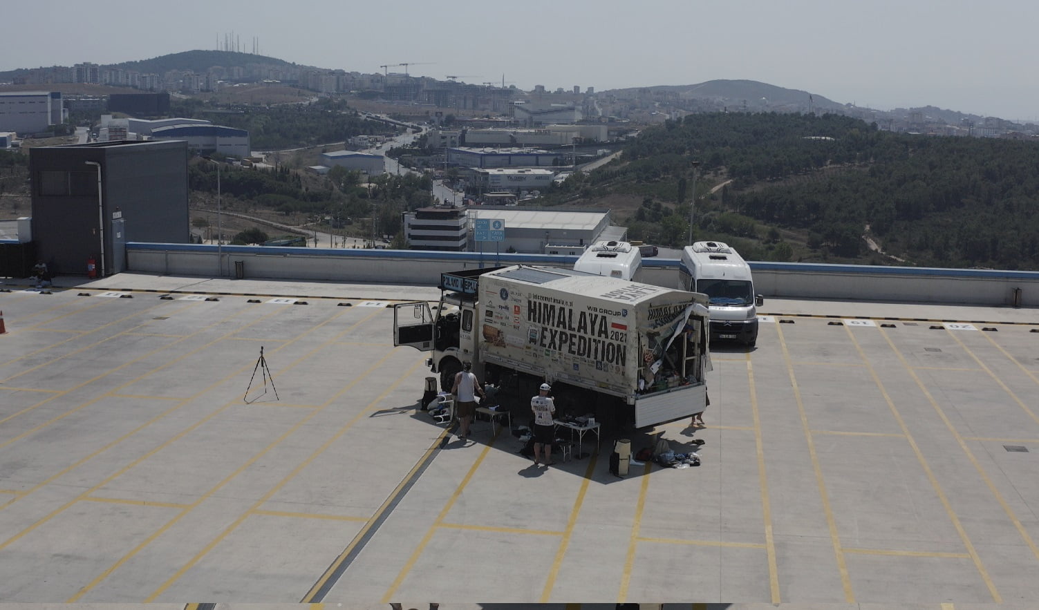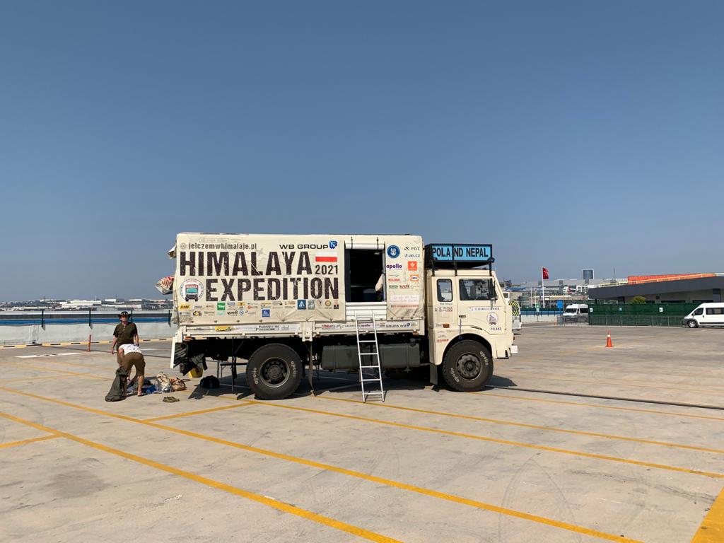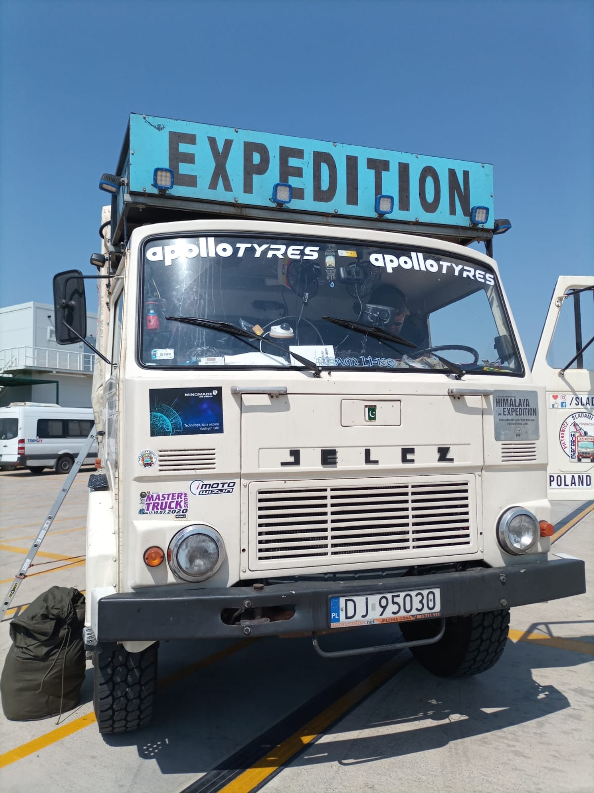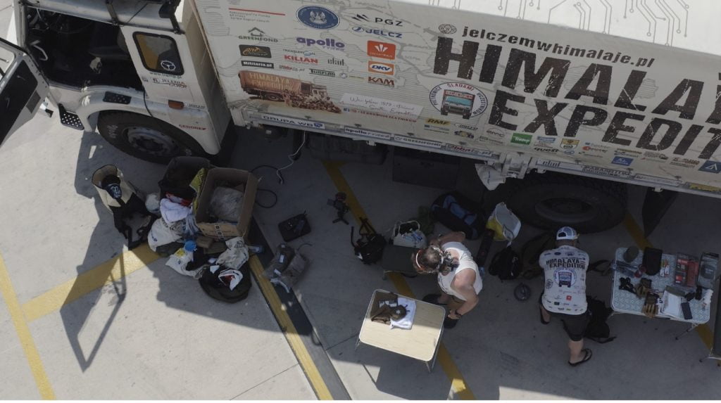 Wracamy do siedziby Ekol do naszego Jelonka na prawdziwy szczyt z betonu. Na plac wykładamy większość rzeczy użytkowych. Termometr poza skalą (50 over). Po akcji “przepaku” dziwnym trafem zyskujemy przestrzeń w naszej Himalaya Lodge. Wreszcie Jelonek ma powieszoną zasłonę (bo nie było czuć jak opala ramię). Darek Załuski z należytą dla filmowca starannością uchwytuje kilka nowych kadrów.