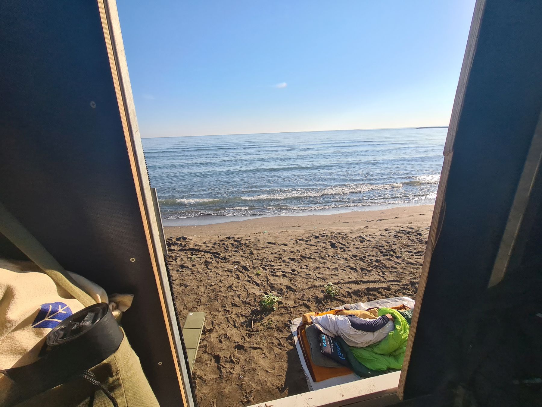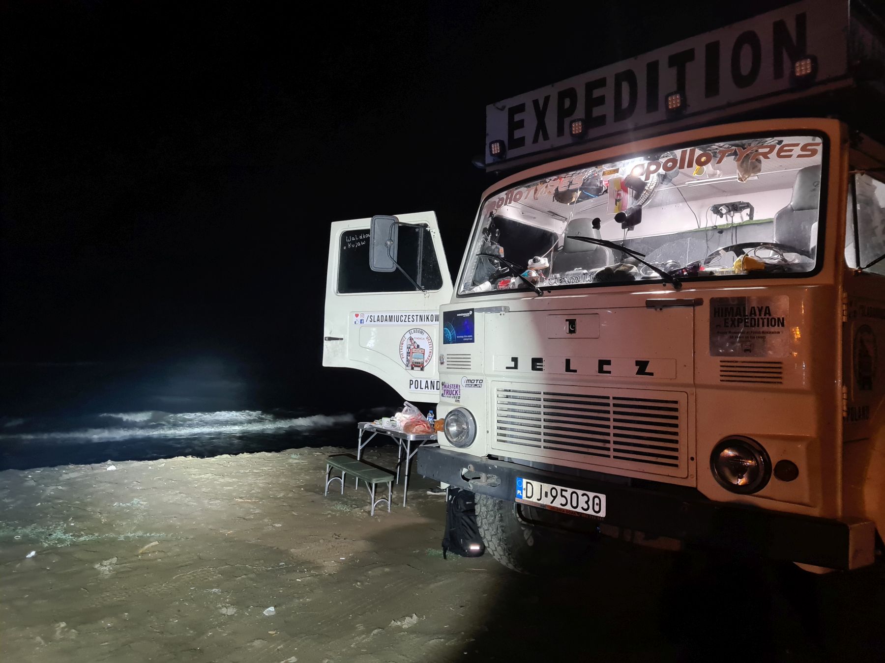 Noc prawie idealna. Tę fantastyczną morską scenerię urozmaicali wzmożeni jak nigdy lokalsi. Miejscówka do spania super, tylko oni ze swoją gościnnością, zafrapowani Jelonkiem, nie dawali nam chwili spokoju, częstując herbatą z herbatnikami, a nawet zapraszając do swoich domów. My zaś po 400 km hurgotu Jelonka w kabinie chcielibyśmy chwilę spokoju i odpoczynku. Wzięliśmy ich na sposób i pod pretekstem „maybe tomorrow” zgasiliśmy latarki i poszliśmy spać! Są to jednak twardzi zawodnicy, którzy wracali pod Jelonka nawet po ciemku gdy my już smacznie spaliśmy.