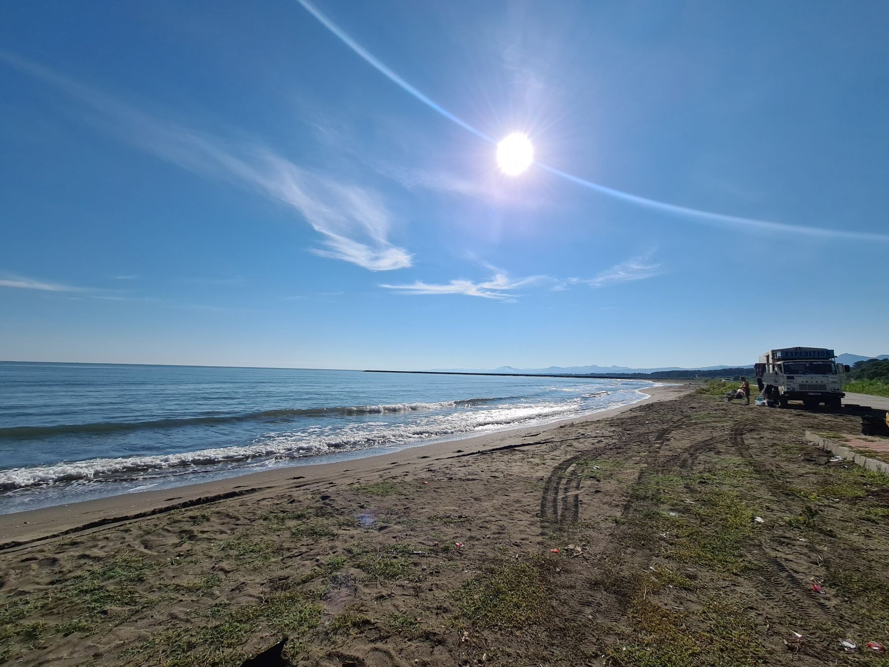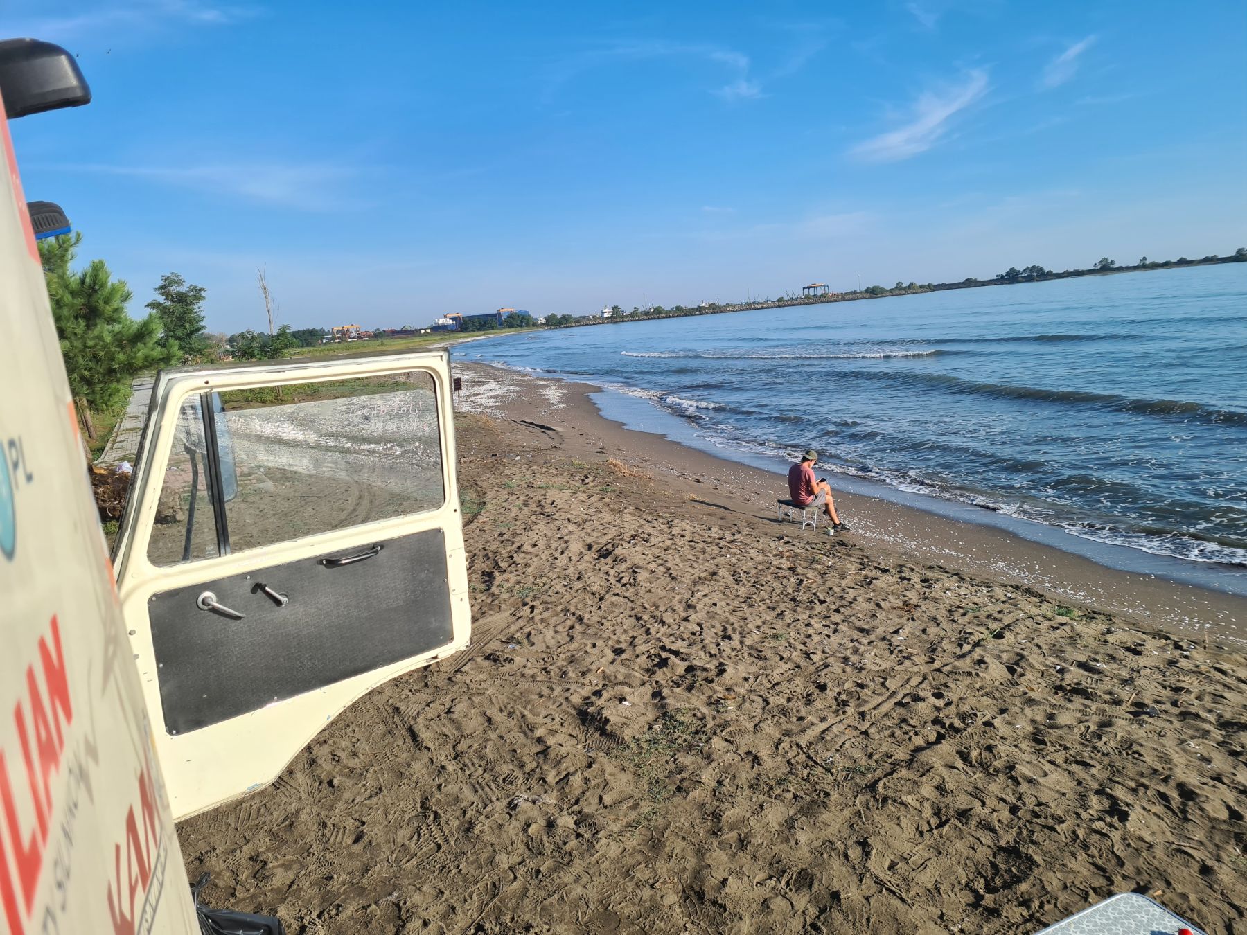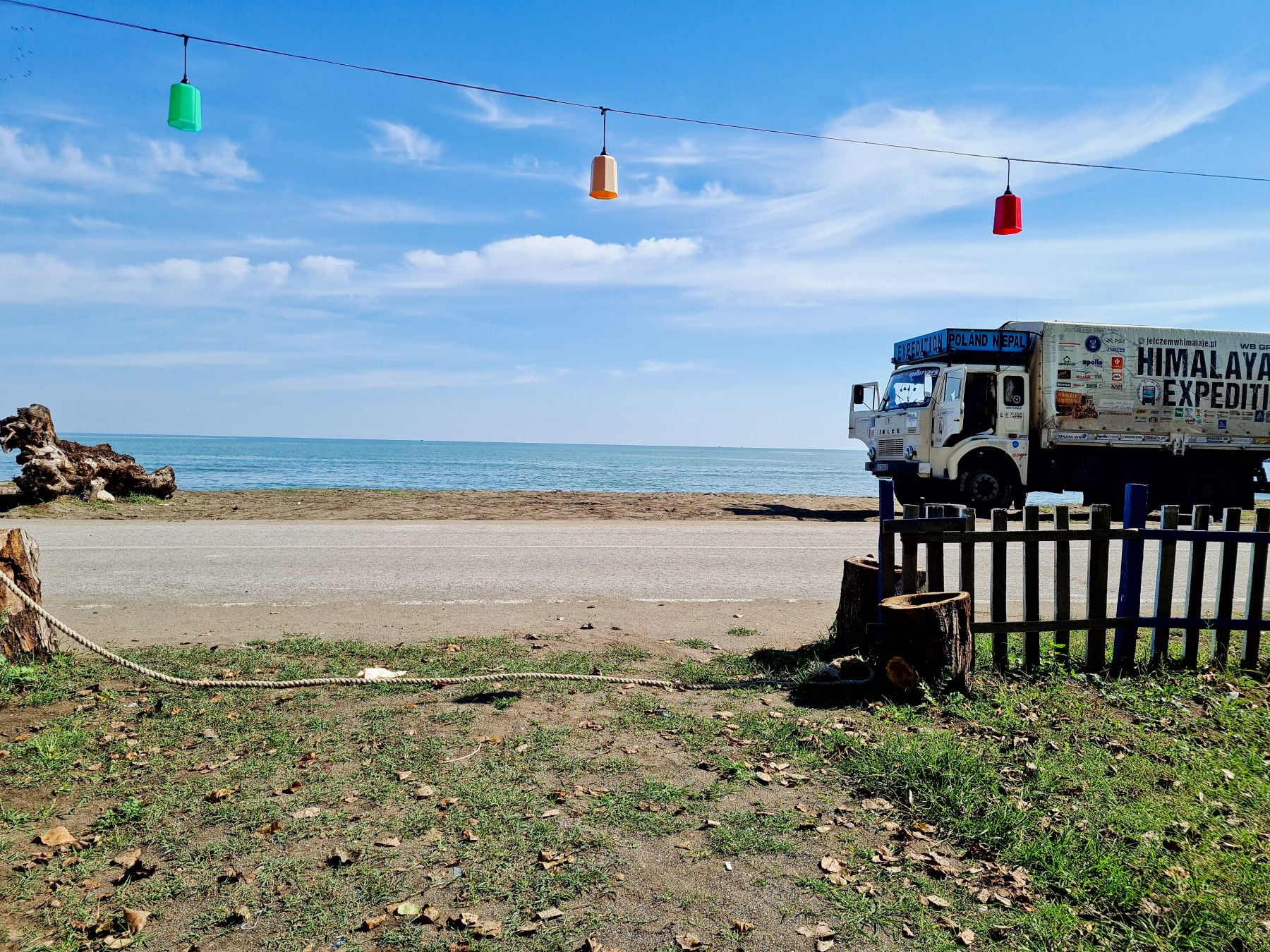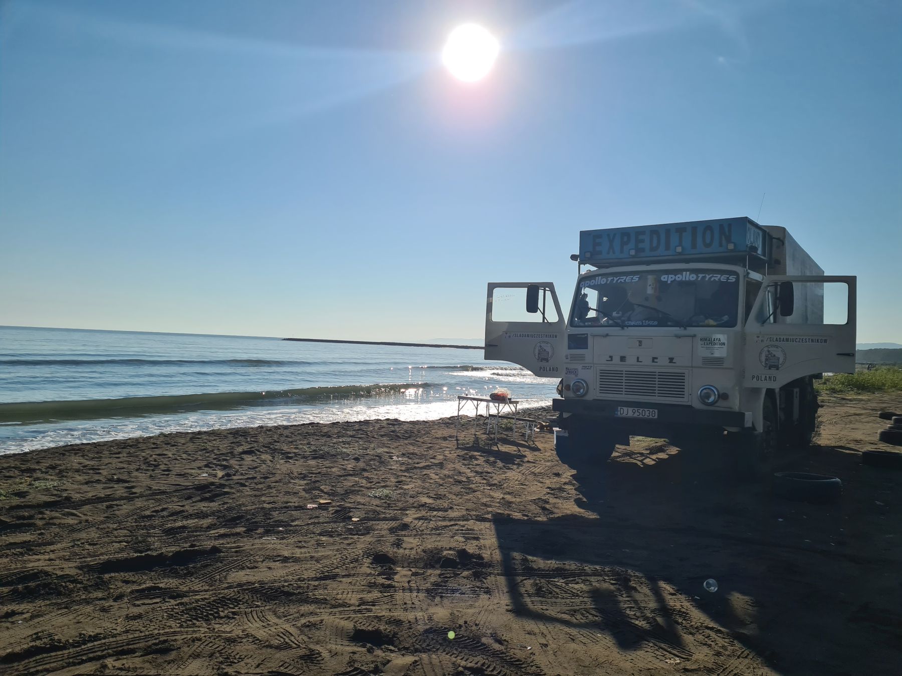 O ironio! przez górskie przełęcze i serpentyny chcemy dotrzeć do wybrzeża. Jakie to są jednak piękne serpentyny. Trawersami pną się w górę nieliczne, arcytrudne (jak się domyślamy) w budowie domy, na wierzchołkach zaś liczne meczety, z których znów słychać znane nam już pojękiwania o modlitwę. Mijamy miejscowość Karacukur (nie mylić z Karakorum), a tam już tylko z górki. Pogoda nas tu nie rozpieszcza. Jest tak chłodno, że nasz chytry plan porzucenia długich spodni jak tylko opuścimy Iran szybko się kończy. Przeprosiliśmy się także z bluzami. Docieramy nad Morze Czarne. Tu odcinkiem wzdłuż wybrzeża podążamy już tylko na zachód oglądając z kabiny Jelonka zachód słońca chowający się za horyzontem wzmożonych dość mocno fal. W akompaniamencie szumu Morza Czarnego rozbijamy kolejny biwak na plaży. Herbatka, tuńczyk, mortadela, świeży chlebek z masełkiem to już chyba pełnia szczęścia. Dobranoc.
