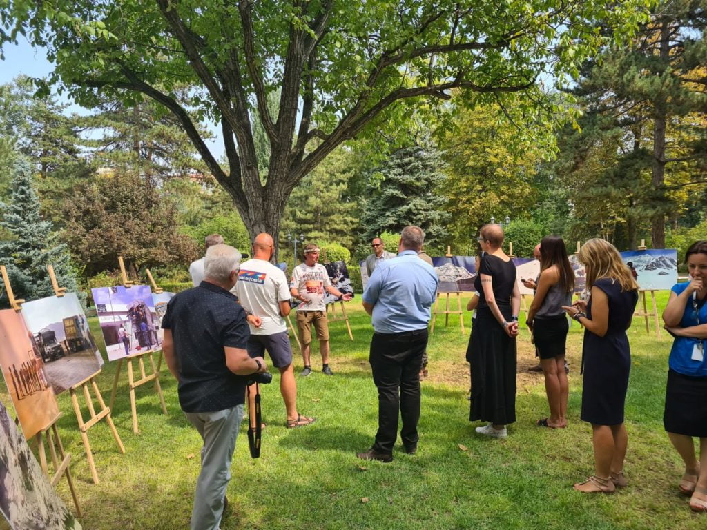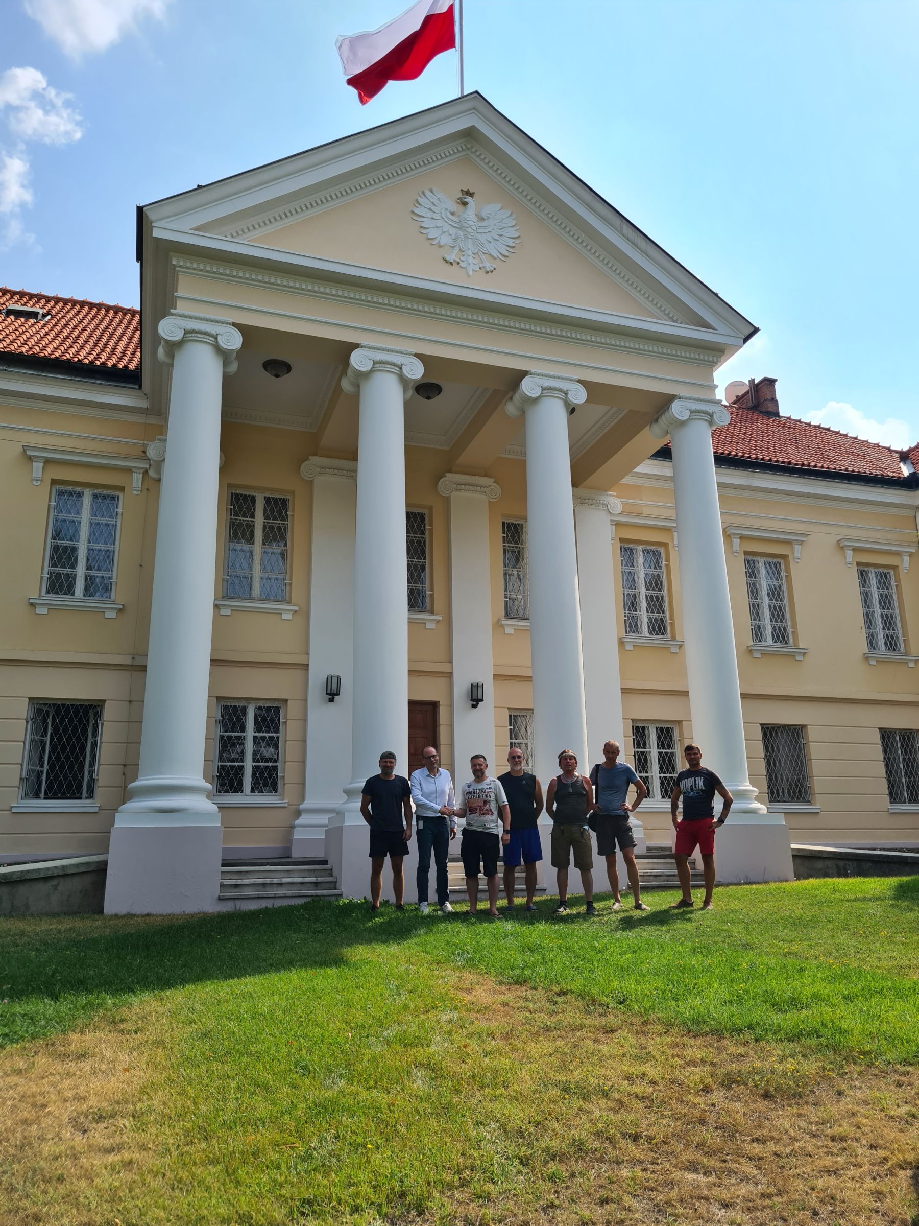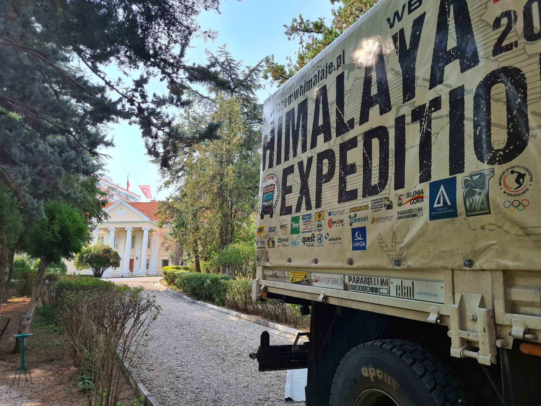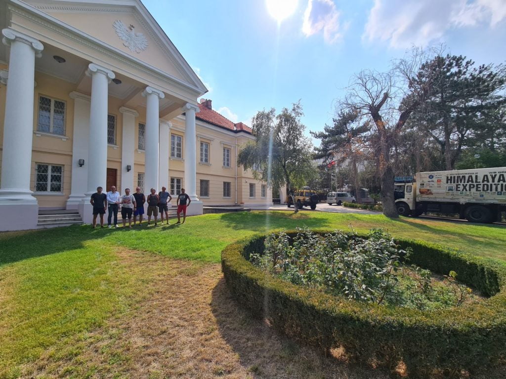Krople deszczu budzą mnie na hamaku chwilę po 6:00. Chwilę potem nie ma już śladu po deszczu. Bajeczny park z bujną roślinnością tuż przy ambasadzie dopieszcza jeszcze o poranku ogrodnik. Włącza zraszacze. Piękną scenerię dopełnia „zbiornik przeciwpożarowy” z krystaliczną wodą. Przypadkiem jest tam też zestaw ogrodowy z grillem, a nieopodal nasza łazienka, tuż przy korcie tenisowym. Wstaje życie. Podczas śniadania przychodzi nas powitać Sekretarz placówki. Poranny briefing, dostawa sztalug na czas i rozkładamy wystawę. Mamy zgodę na transmisję na żywo korzystając z kamer zainstalowanych w aucie. W między czasie zostaliśmy zaproszeni na herbatę do Charge’ d affaires Ambasady. Pan Minister bardzo entuzjastycznie wsłuchiwał się w historię o polskim himalaizmie, a także o Jelonku, bo jak się okazało jest miłośnikiem motoryzacji. Wracając do parku zwiedzamy jeszcze przepiękne wnętrza ambasady.