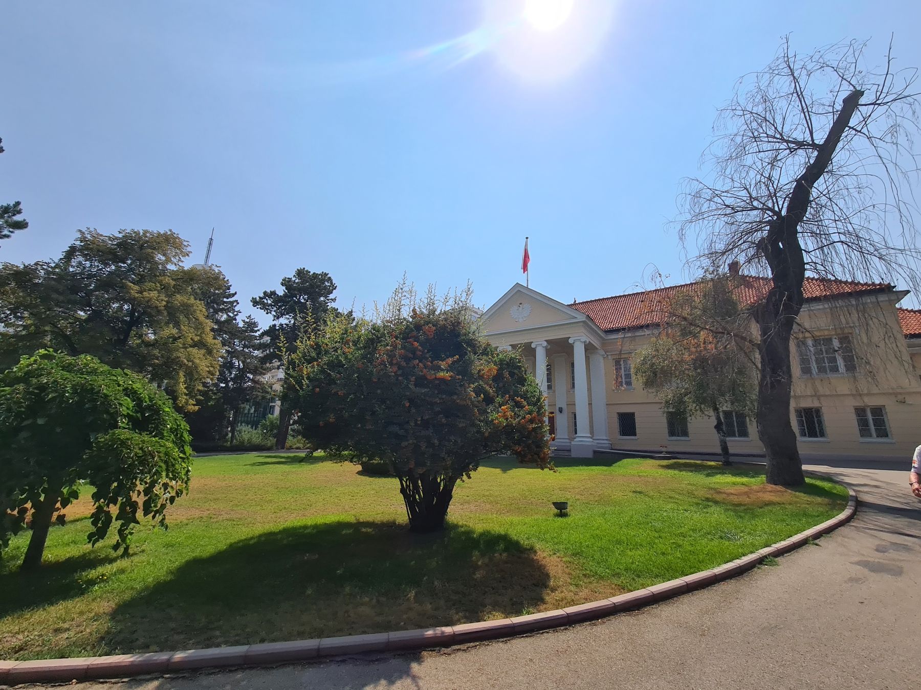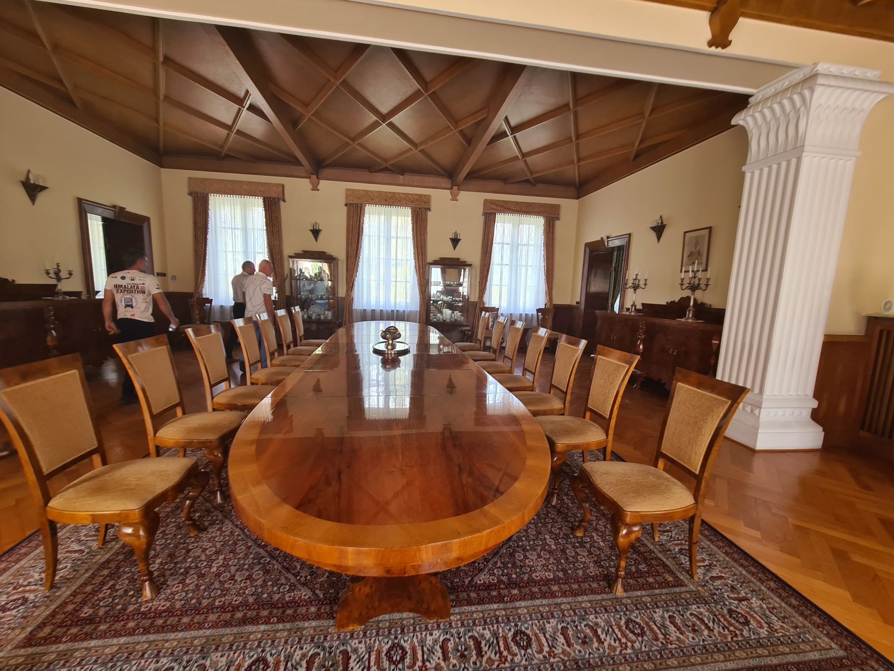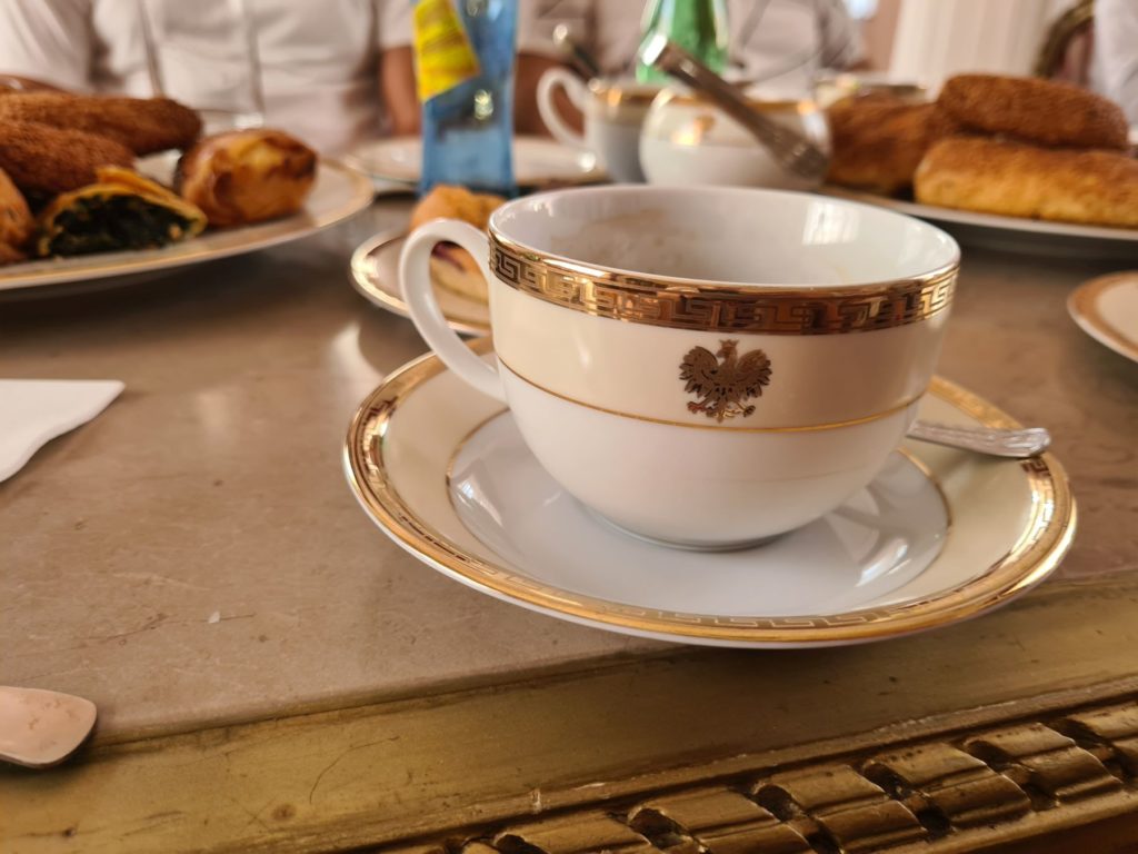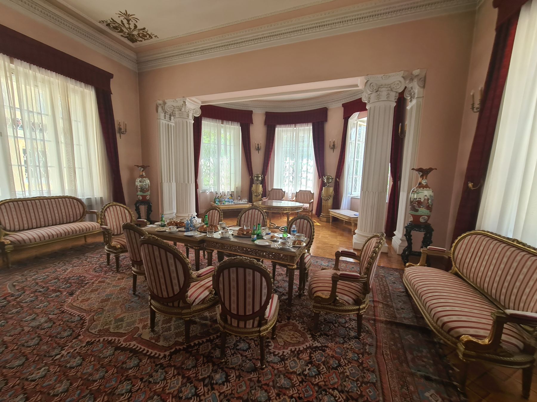 Krople deszczu budzą mnie na hamaku chwilę po 6:00. Chwilę potem nie ma już śladu po deszczu. Bajeczny park z bujną roślinnością tuż przy ambasadzie dopieszcza jeszcze o poranku ogrodnik. Włącza zraszacze. Piękną scenerię dopełnia „zbiornik przeciwpożarowy” z krystaliczną wodą. Przypadkiem jest tam też zestaw ogrodowy z grillem, a nieopodal nasza łazienka, tuż przy korcie tenisowym. Wstaje życie. Podczas śniadania przychodzi nas powitać Sekretarz placówki. Poranny briefing, dostawa sztalug na czas i rozkładamy wystawę. Mamy zgodę na transmisję na żywo korzystając z kamer zainstalowanych w aucie. W między czasie zostaliśmy zaproszeni na herbatę do Charge’ d affaires Ambasady. Pan Minister bardzo entuzjastycznie wsłuchiwał się w historię o polskim himalaizmie, a także o Jelonku, bo jak się okazało jest miłośnikiem motoryzacji. Wracając do parku zwiedzamy jeszcze przepiękne wnętrza ambasady.